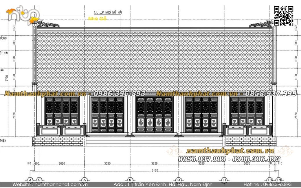 + Gian giữa 3,22m, hai gian bên 3,02m và 2 gian buồng 3,4m (kích thước tim cột).