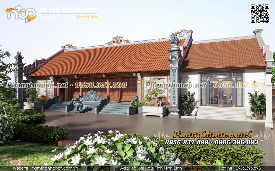 - Bố trí gian thờ: Gian giữa phải được ưu tiên vị trí trang trọng nhất. Kích thước hoành phi, câu đối phải được đo đạc vừa vặn với khoảng cách cột cái và câu đầu.