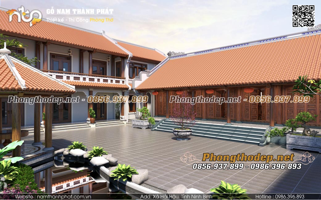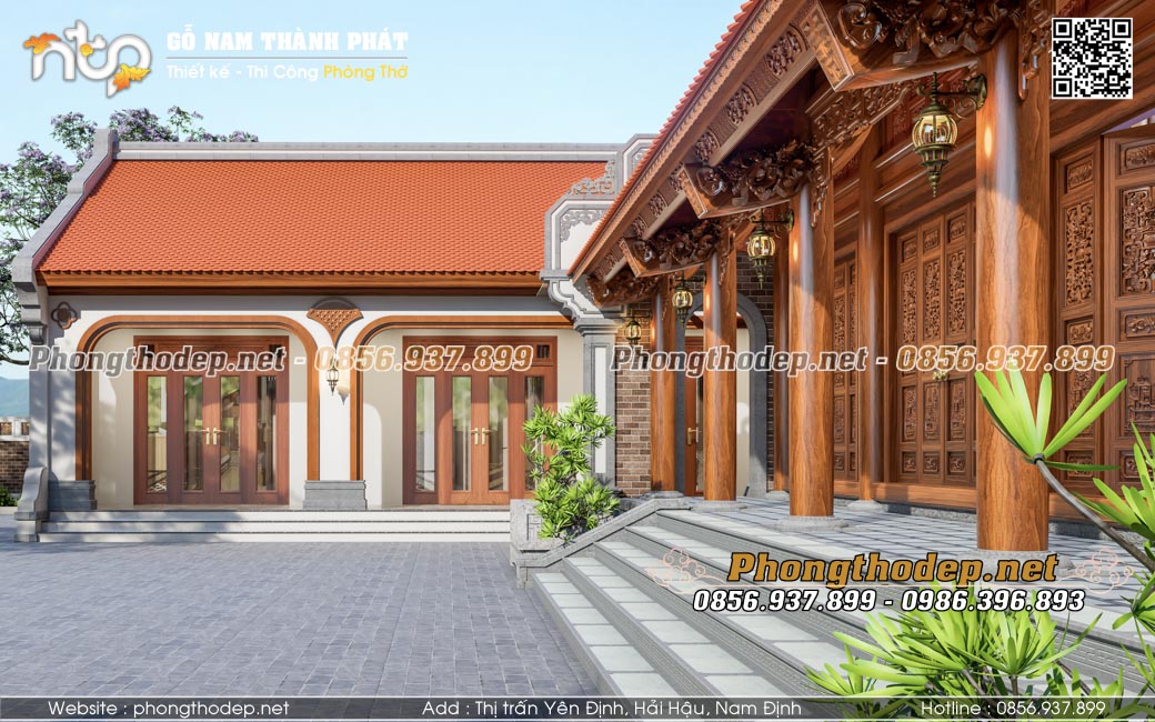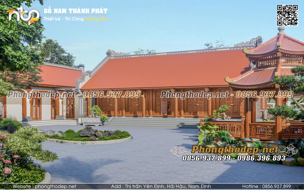 - Công năng đa dạng: Nhà gỗ 5 gian đóng vai trò là không gian thờ cúng linh thiêng và tiếp khách sang trọng. Nhà ngang liền kề sẽ là nơi sinh hoạt, bếp núc, vệ sinh khép kín tiện nghi.