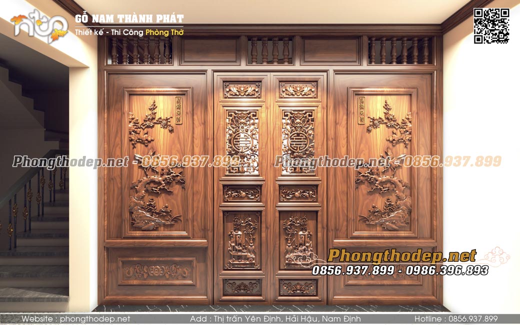 Cửa bức bàn: Cửa bức bàn chạm khắc họa tiết chữ Thọ, Tứ Bình hay Tứ Quý không chỉ tăng tính thẩm mỹ mà còn mang lại ý nghĩa phong thủy tốt lành, giúp bảo vệ không gian thờ cúng khỏi tác động xấu.