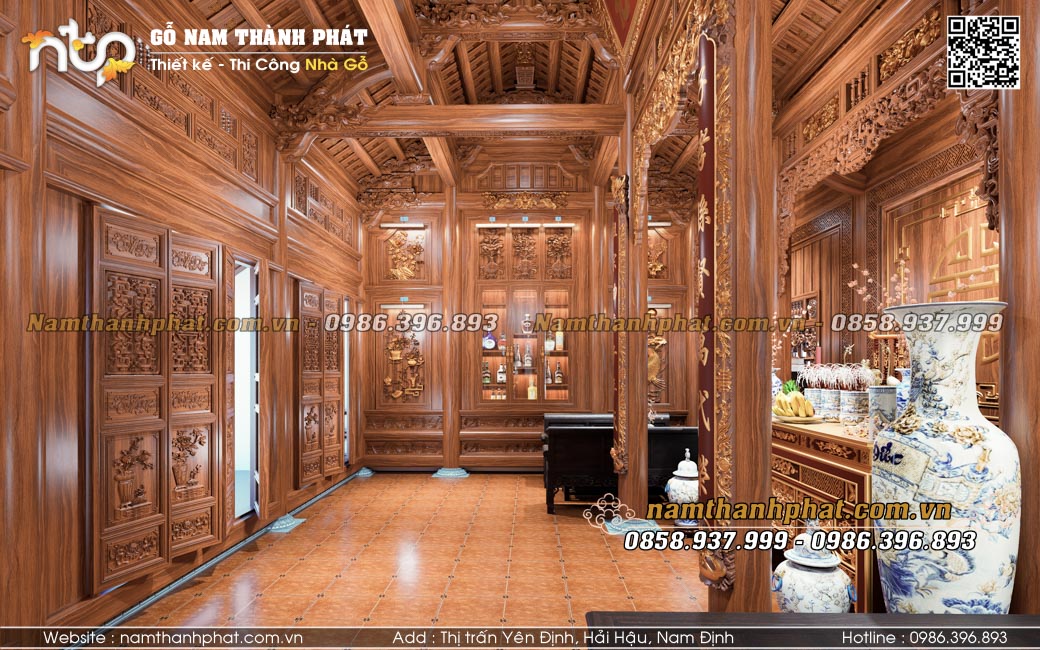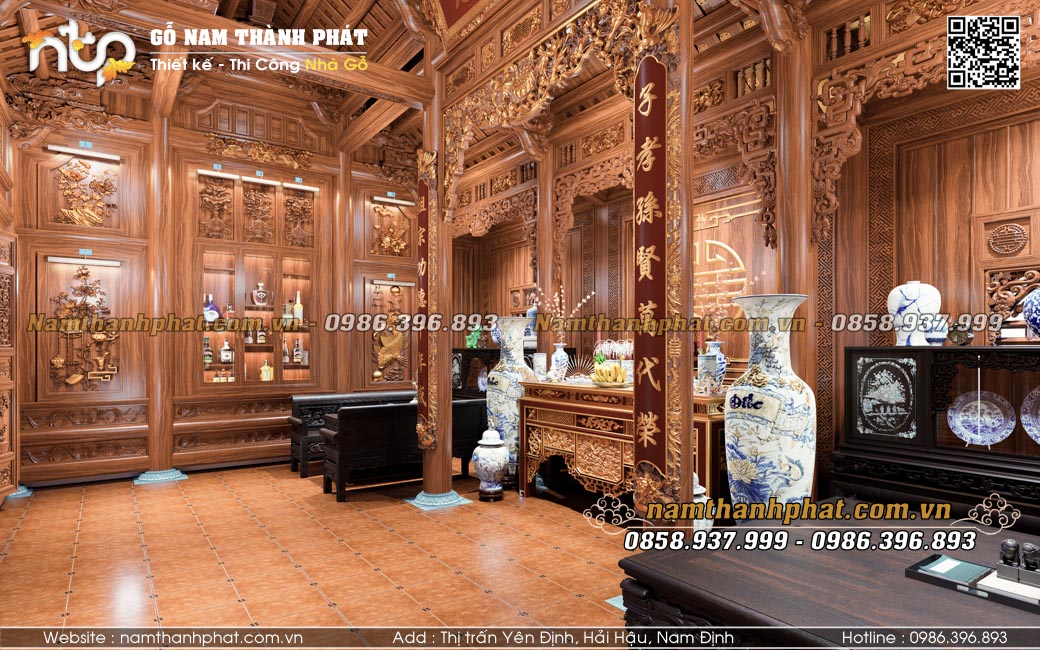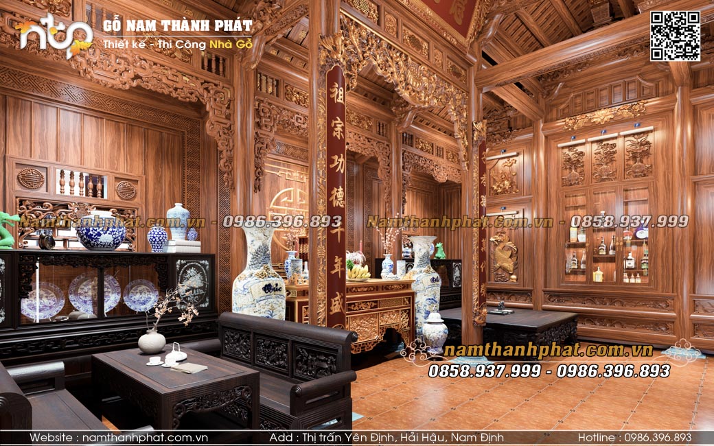 Phần nội thất nhà gỗ 3 gian vì thế không chỉ đơn thuần là nơi bài trí đồ gỗ hay hoành phi câu đối, mà còn là linh hồn của không gian tâm linh, thể hiện tấm lòng hiếu nghĩa của con cháu đối với dòng tộc.