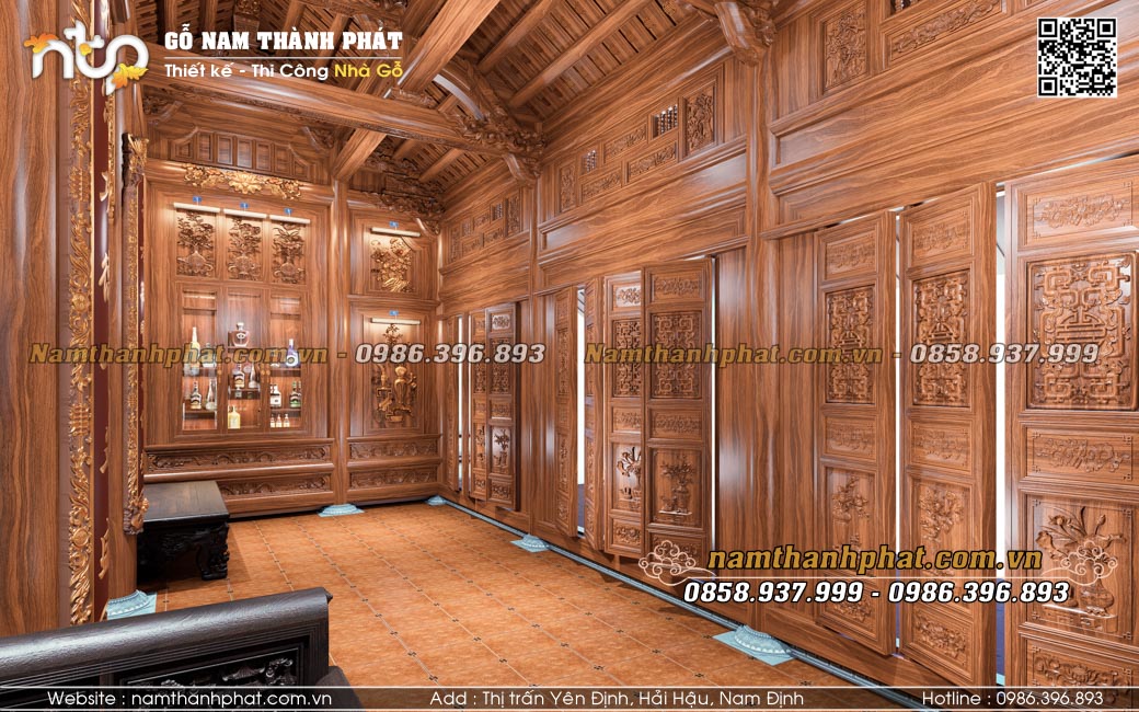 Thiết kế nội thất nhà gỗ 3 gian với trung tâm là các đồ thờ nội thất sơn son thếp vàng kỹ lưỡng, trang nghiêm. Bên cạnh đó là các món đồ thờ đặc trưng dường như không thể thiếu trong các không gian nội thất nhà gỗ. Đó là sập gụ, trường kỷ, tủ chè.. vừa là để sử dụng cho cuộc sống sinh hoạt hàng ngày như tiếp khách, trưng bày đồ, nghỉ ngơi. Lại vừa mang tính thẩm mỹ tô điểm thêm vẻ đẹp hoài cổ mà sang trọng cho căn nhà. Phần vách thuận được thiết kế tủ trưng bày những món đồ quý giá hay những chai rượu lâu năm mà chú dày công sưu tầm.