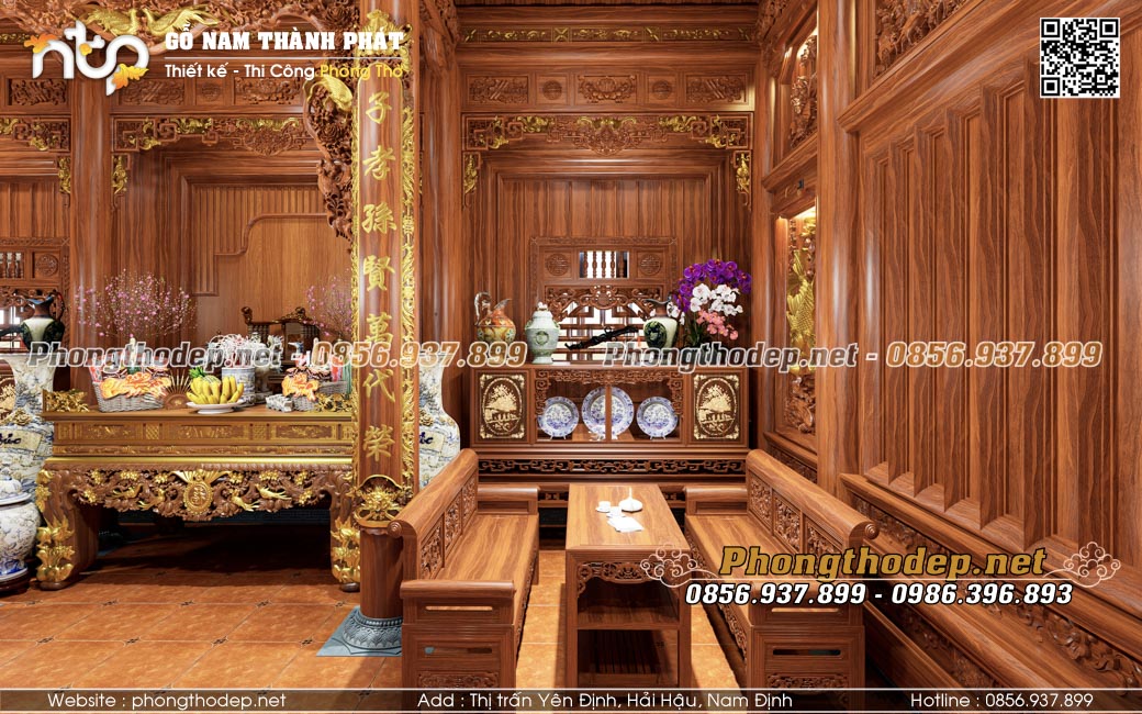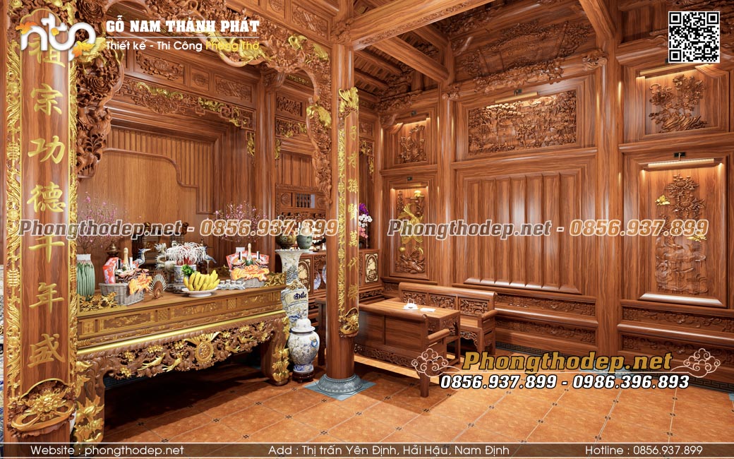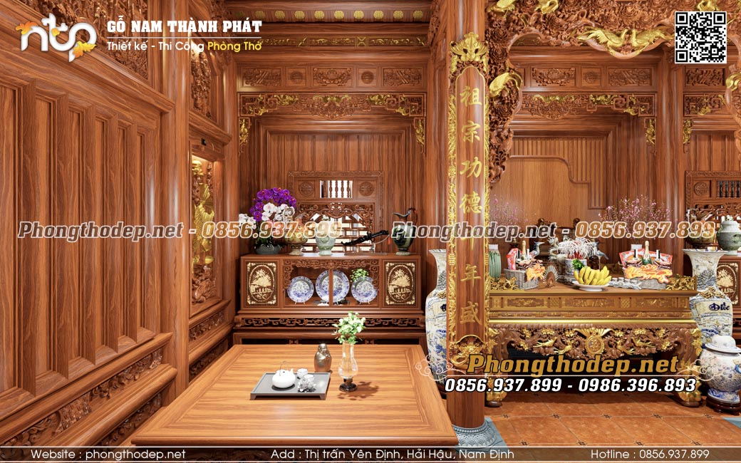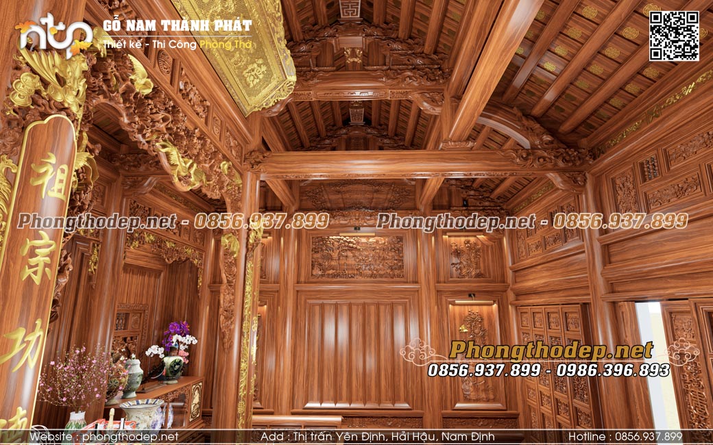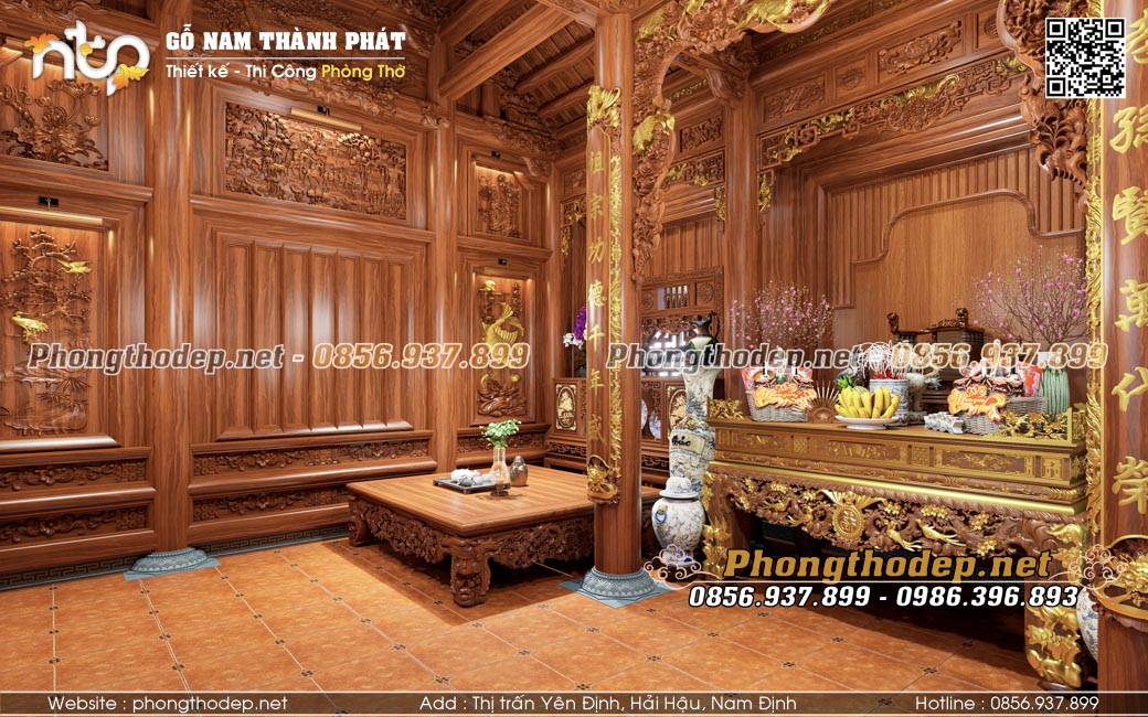 Gian giữa rộng và trang trọng nhất dành làm không gian thờ cúng uy nghiêm. Các món đồ thờ nội thất như bàn thờ, cửa võng, câu đối, đại tự cũng đều được làm từ gỗ Gõ đỏ Pachy, dát vàng điểm nhấn ở các chữ viết, con giống... khiến không gian thờ càng thêm lung linh, sang trọng.