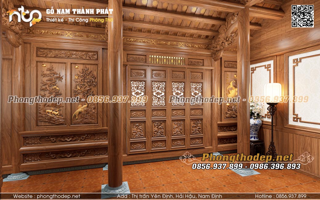 - Cửa võng: Thiết kế theo lối cổ với hoa văn "Mai Điểu" hoặc "Ngũ Phúc", tạo nên một bức rèm gỗ ngăn cách linh thiêng giữa không gian thờ và không gian ngoài.