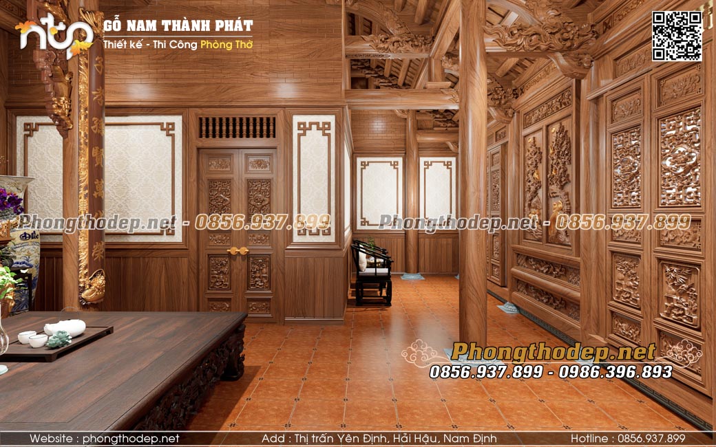 Mẫu thiết kế tại tầng 4 này không đơn thuần là nơi đặt bàn thờ, mà là một "quần thể" nội thất gỗ tinh xảo, tái hiện trọn vẹn hồn cốt của nếp nhà cổ.