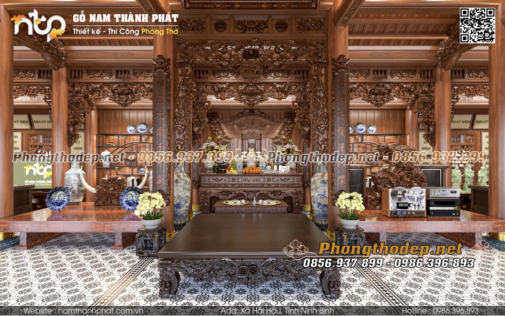 Tâm điểm của nội thất nhà gỗ 5 gian chính là gian giữa. Chúng tôi sử dụng hệ thống Án gian thờ tam cấp được đục tay thủ công tinh xảo.