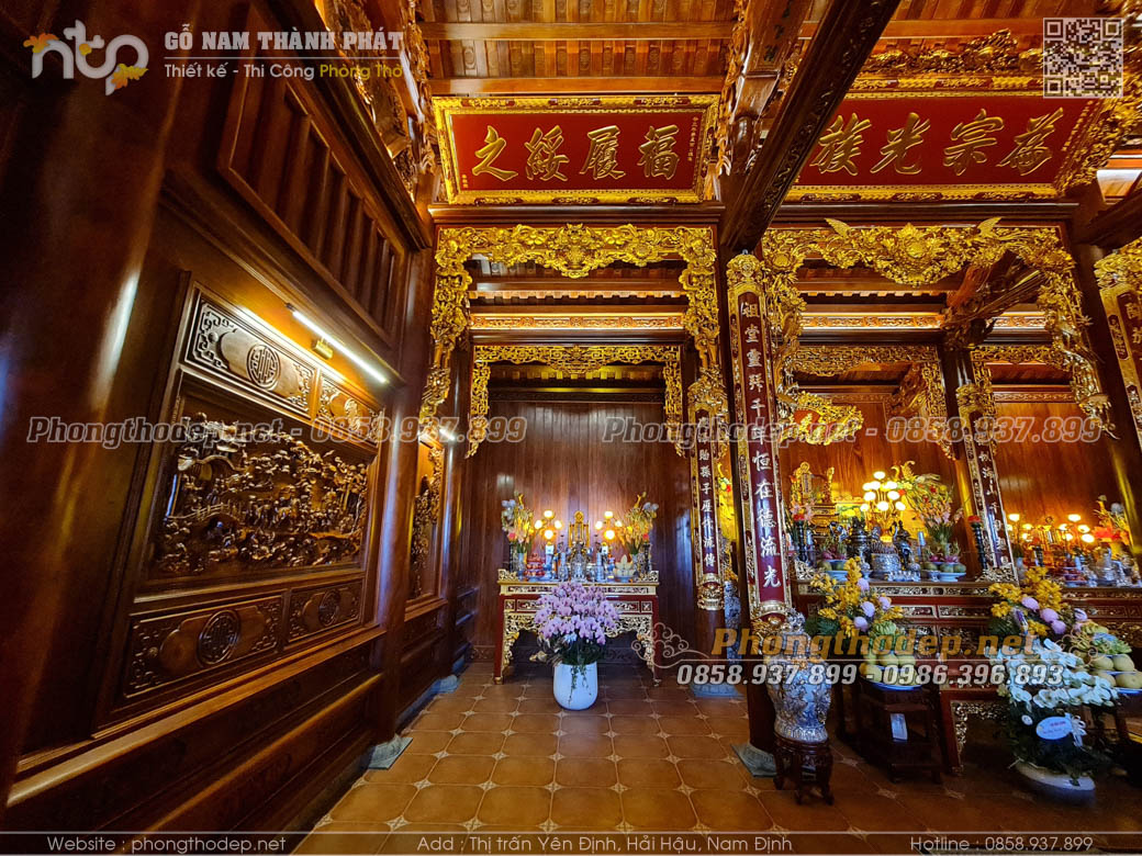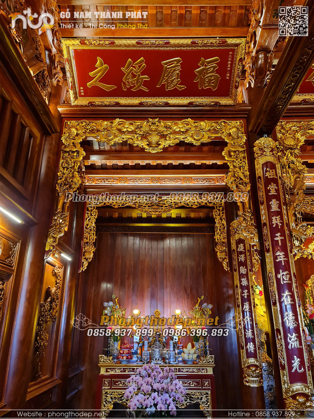 Quá trình thi công phòng thờ cho gia chủ ở Bình Dương đã diễn ra suôn sẻ và tốt đẹp với các hạng mục nội thất cơ bản bao gồm: Sập thờ tam cấp gian giữa và sập thờ hai gian bên, cửa võng hồng trĩ, ngũ phúc, đại tự, cuốn thư, câu đối sơn son thếp vàng nổi bật và sang trọng, bắt mắt. Toàn bộ phòng thờ 3 gian nhà gỗ với sắc đỏ của gỗ gõ cao cấp, màu vàng của đèn cùng với các đồ nội thất trang trí phong cách truyền thống tạo cho người xem cảm giác thật ấm cúng và linh thiêng.