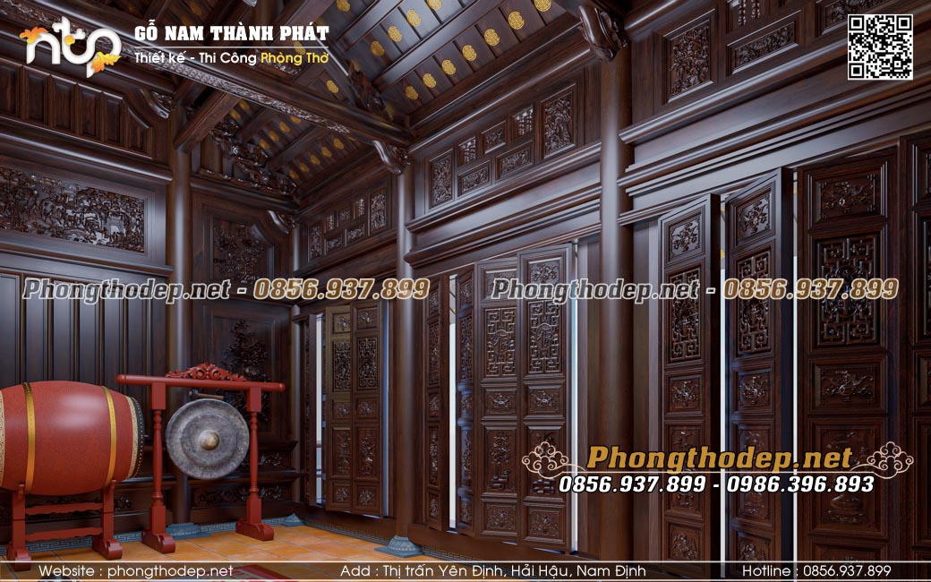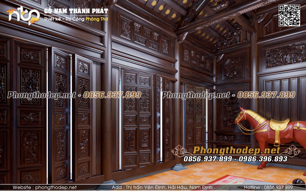 Công trình này cũng đòi hỏi yêu cầu kỹ thuật cao để có thể thiết kế và thi công phòng thờ theo đúng yêu cầu của chủ đầu tư. Và đây chính là một ví dụ về một không gian phòng thờ truyền thống trong biệt thự gia đình với những nội thất gỗ gõ chạm khắc cầu kỳ, tỉ mỉ, có độ hoàn thiện cao. Nội thất Nam Thành Phát mời quý vị cùng tham khảo.