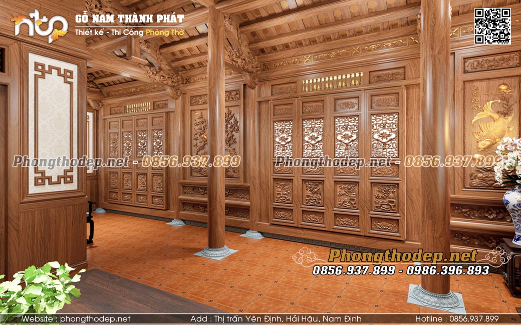 - Cửa võng: Thiết kế theo lối cổ với hoa văn "Mai Điểu" hoặc "Ngũ Phúc", tạo nên một bức rèm gỗ ngăn cách linh thiêng giữa không gian thờ và không gian ngoài.
