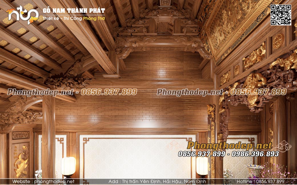 Mẫu thiết kế tại tầng 4 này không đơn thuần là nơi đặt bàn thờ, mà là một "quần thể" nội thất gỗ tinh xảo, tái hiện trọn vẹn hồn cốt của nếp nhà cổ.